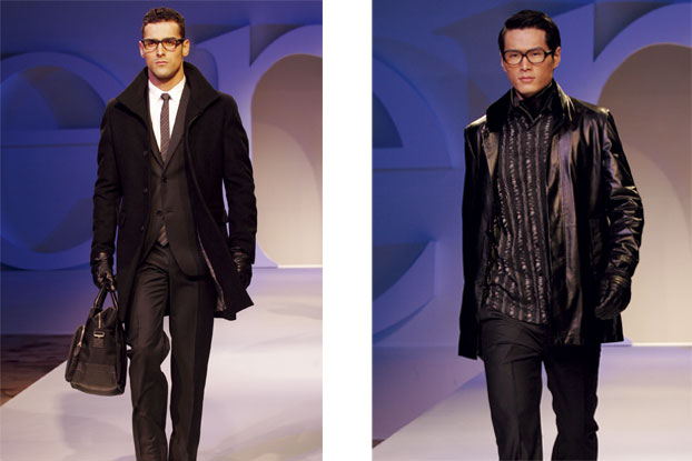 其中的时尚商务系列,以经典而又潮流的黑、白、灰演绎商政人士的冷静与理性,注重收身效果的大衣与西服套装线条流畅,将敏锐与干练的行事作派勾勒得一望可知,来自欧洲名厂的高支羊毛及羊毛与丝混纺的珍贵面料闪现格调不俗的质感,领型的变化、衬衫与领呔的配搭则含蓄散播时尚气息,温文而雅却绽放耀目“型男”魅力。
